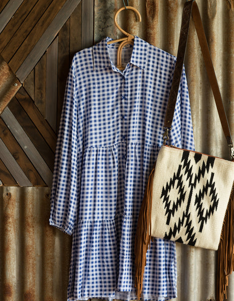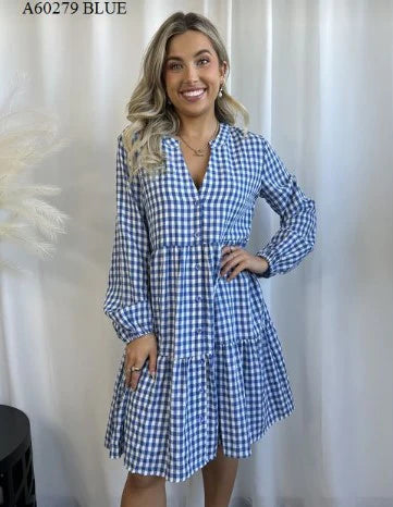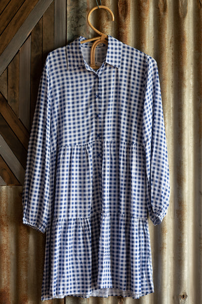 Blue gingham tiered dress with a collar, button down front & elastic cuffs