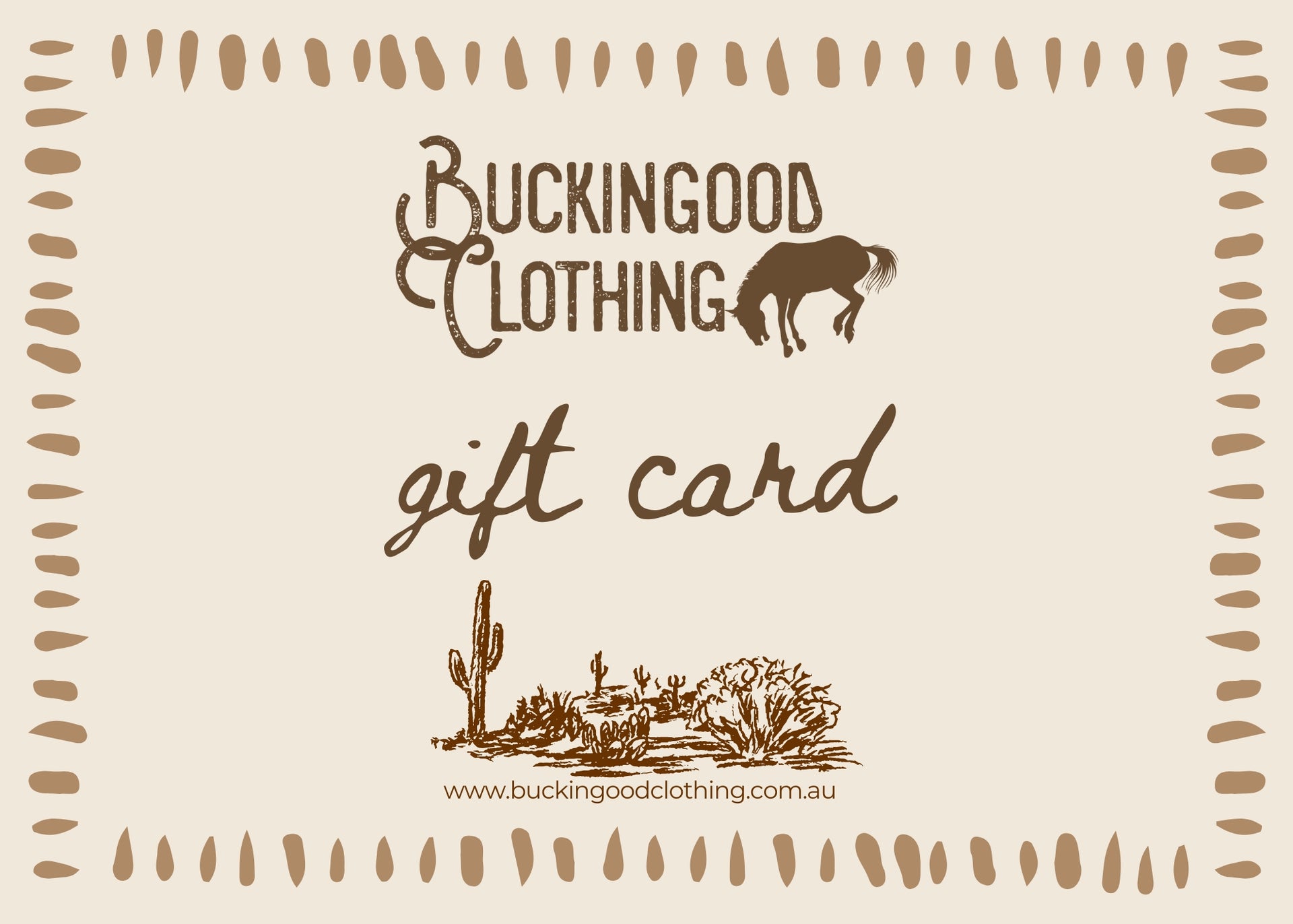This is a digital gift card - if you would like a physical copy, please pop it in the notes of your order, or send us an email. sales@buckingooclothing.com.au