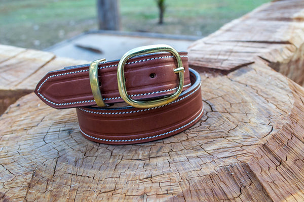 Real leather belts, fully edge stitched with white cotton.