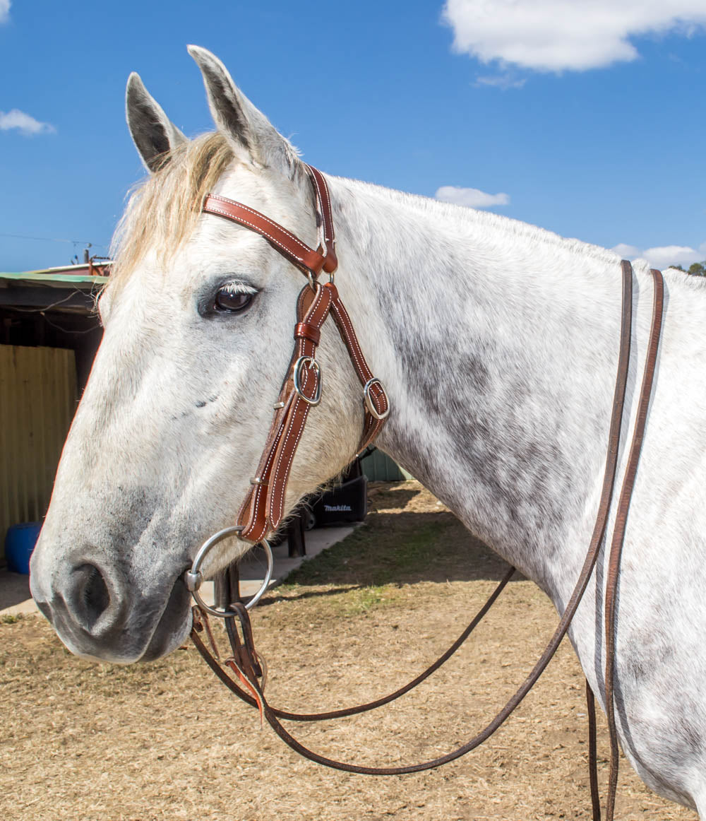 Genuine leather single headstall bridle. Fully edge stitched with nickle plated fittings.