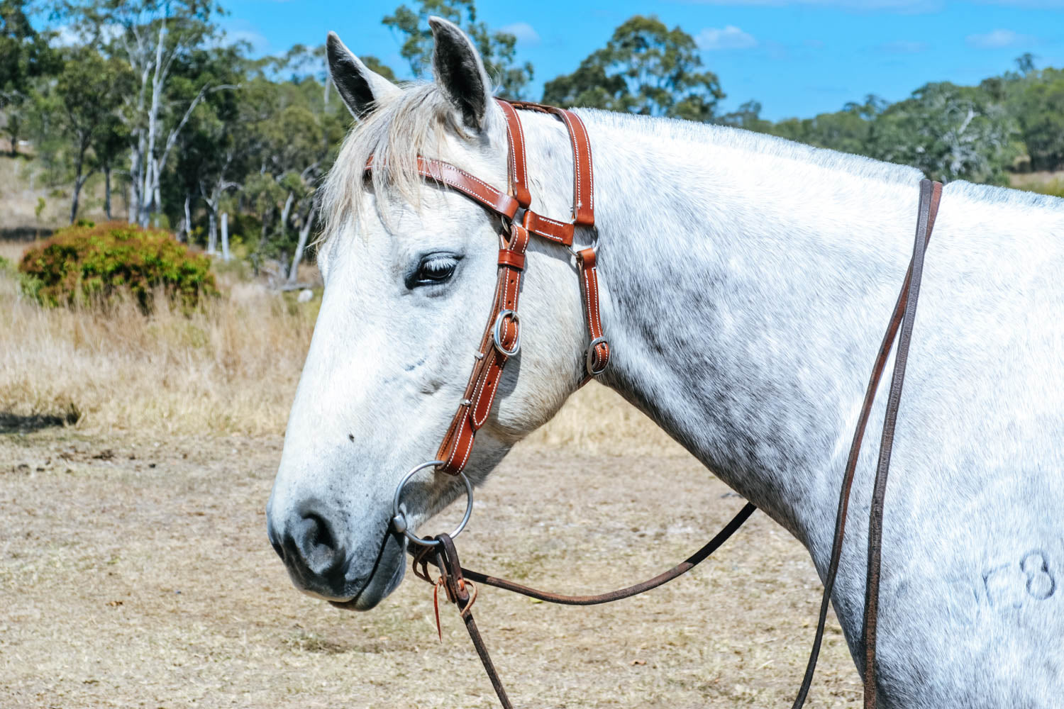 Genuine leather double headstall bridle. Fully edge stitched with nickle plated fittings.