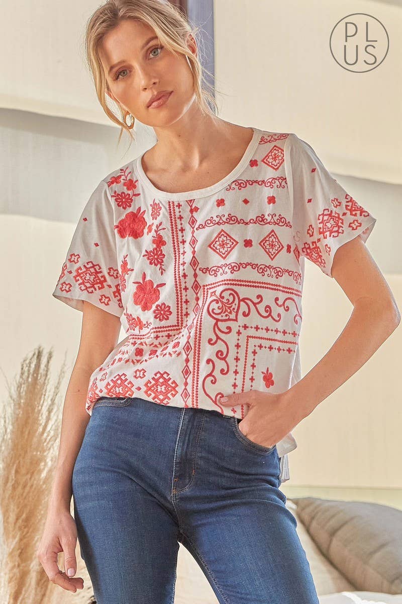 Show off your free spirit in this Faith Embroidered Top. This cozy knit shirt features beautiful southwest-inspired embroidery, making it the perfect addition to your wardrobe for a unique and sophisticated look. Experience total comfort and confidence with this stunning top. Knit embroidered top with round neckline and short sleeve. We love tops like this where you can dress up and down! Knit, stretchy. 100%...View more