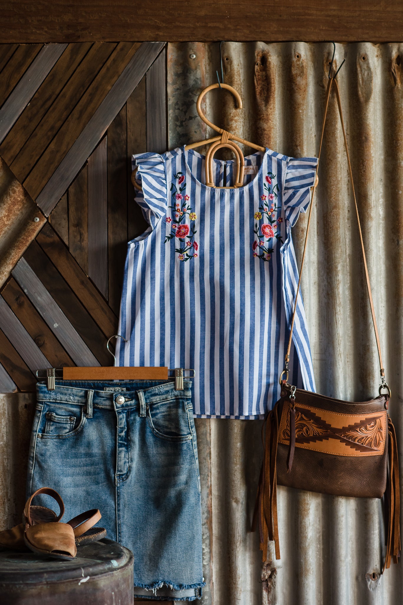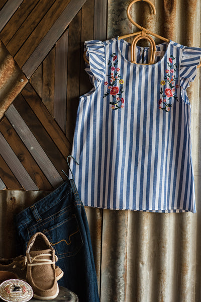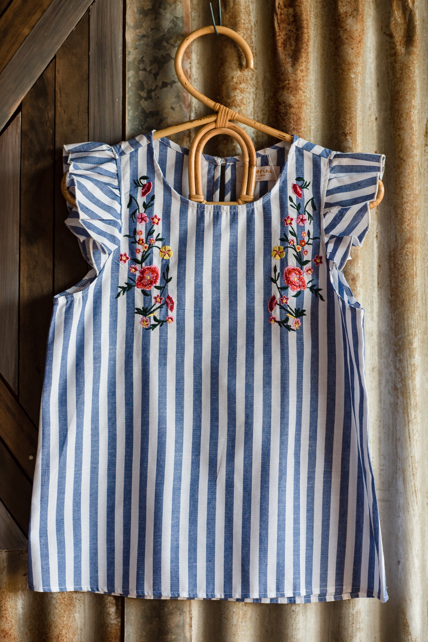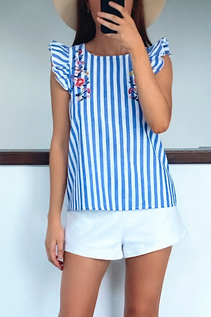 Blue & white stripe with an embroidered floral pattern & a flutter sleeve; it is just perfection