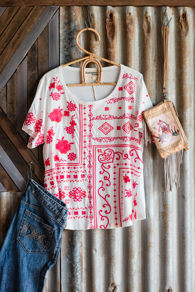 Show off your free spirit in this Faith Embroidered Top. This cozy knit shirt features beautiful southwest-inspired embroidery, making it the perfect addition to your wardrobe for a unique and sophisticated look. Experience total comfort and confidence with this stunning top. Knit embroidered top with round neckline and short sleeve. We love tops like this where you can dress up and down! Knit, stretchy. 100%...View more